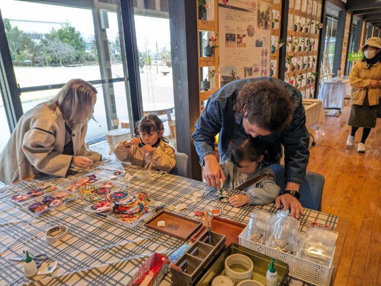 また、子供たちも楽しめる缶バッジ作り、南砺井口つばき学舎の生徒が育てた椿や絞り染めTシャツの展示、保育園児