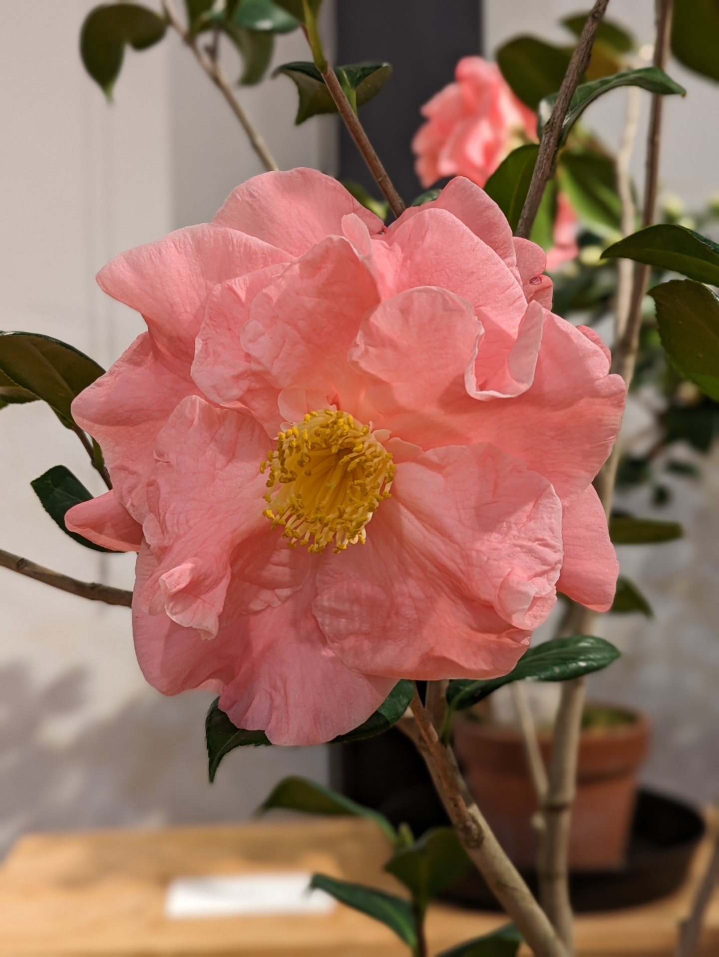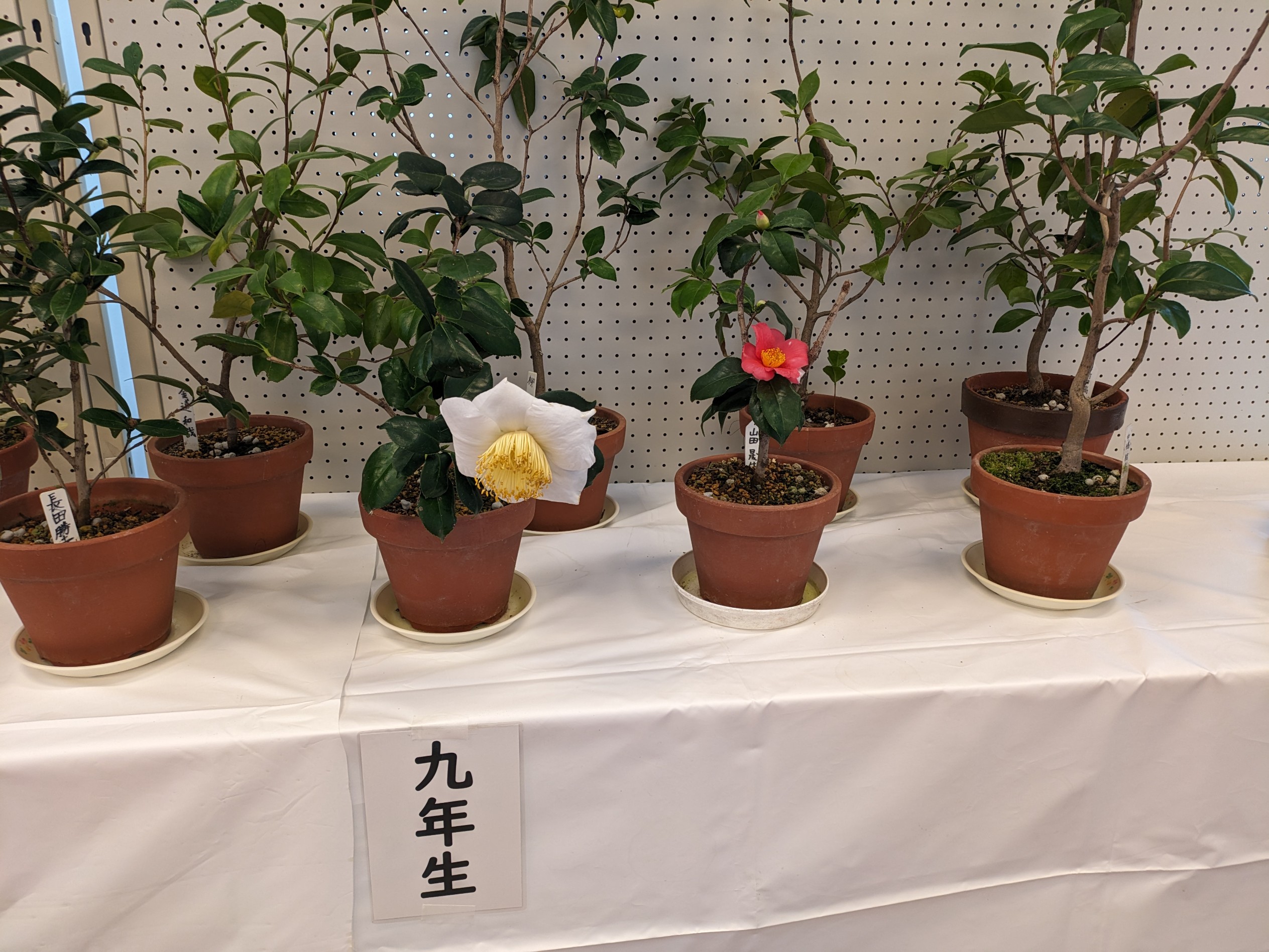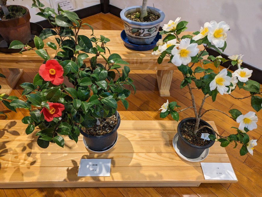 会場となる『いのくち椿館』には、井口地域の椿愛好家の方々やいのくち椿館の育成ハウスの椿の花鉢が数多く展示され、