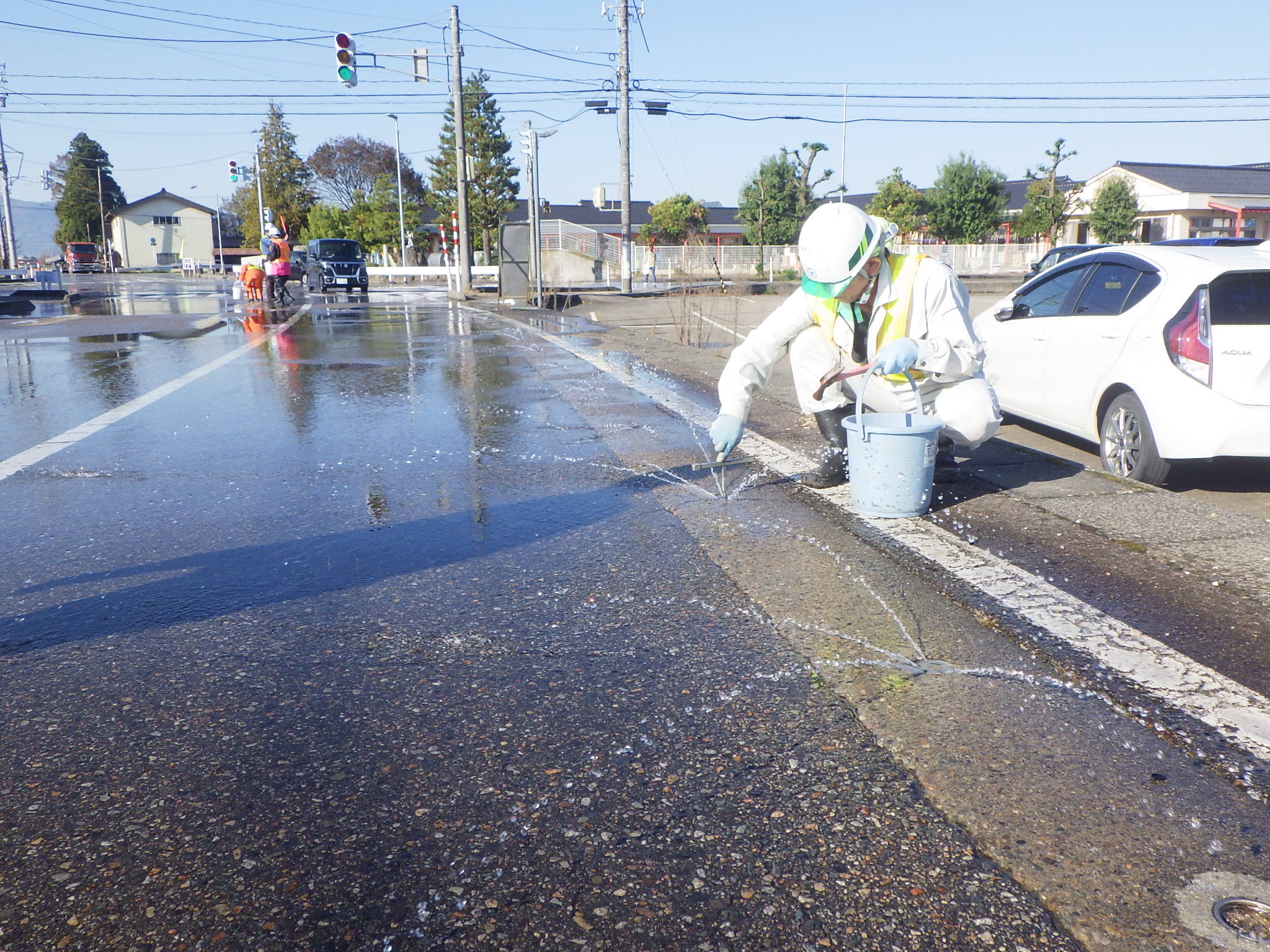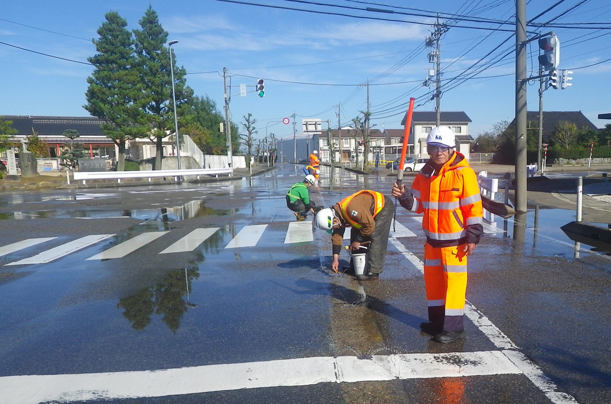 道路の中央や路側帯の白線の沿って消雪装置が取り付けてあるので、自動車の風圧や撥ね上げた水が作業員