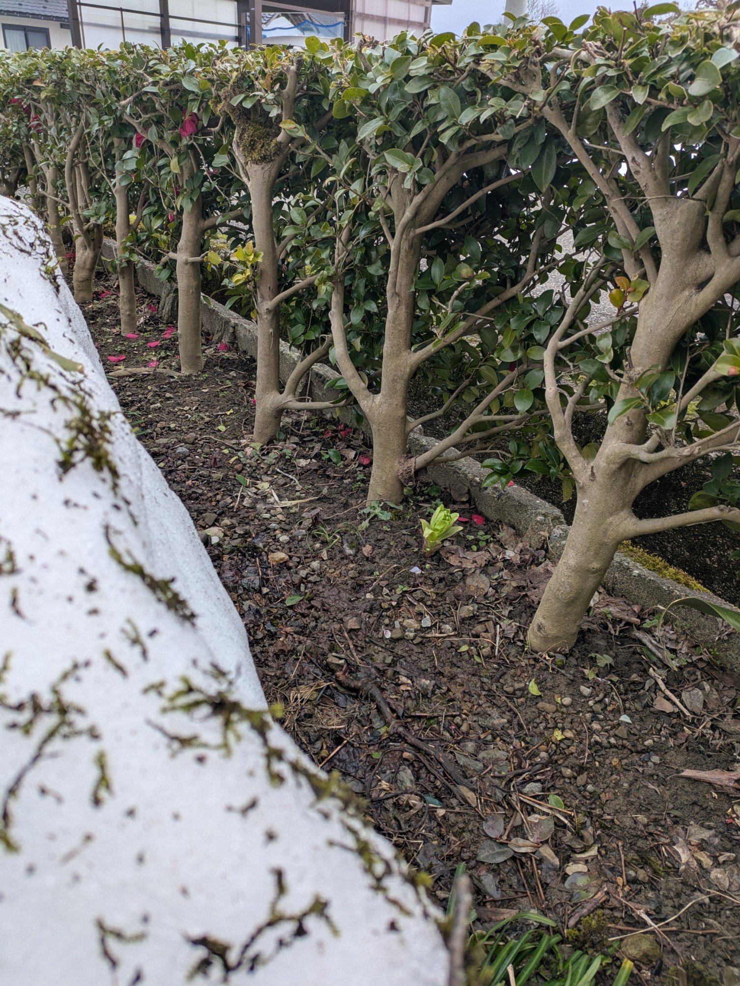 やぶ椿や山茶花(さざんか)の木の下に「待ってました」とばかりに、