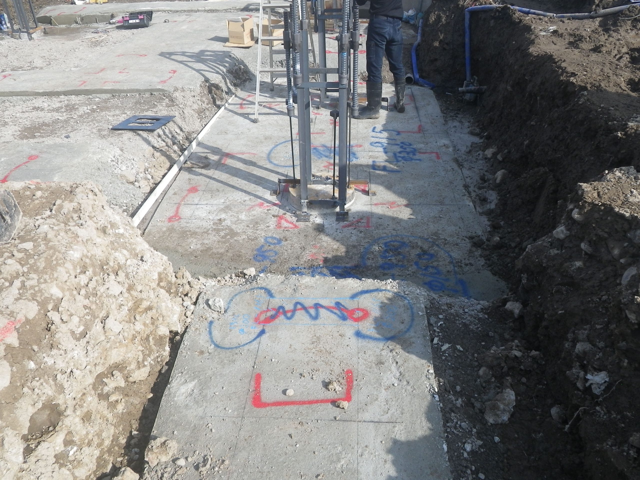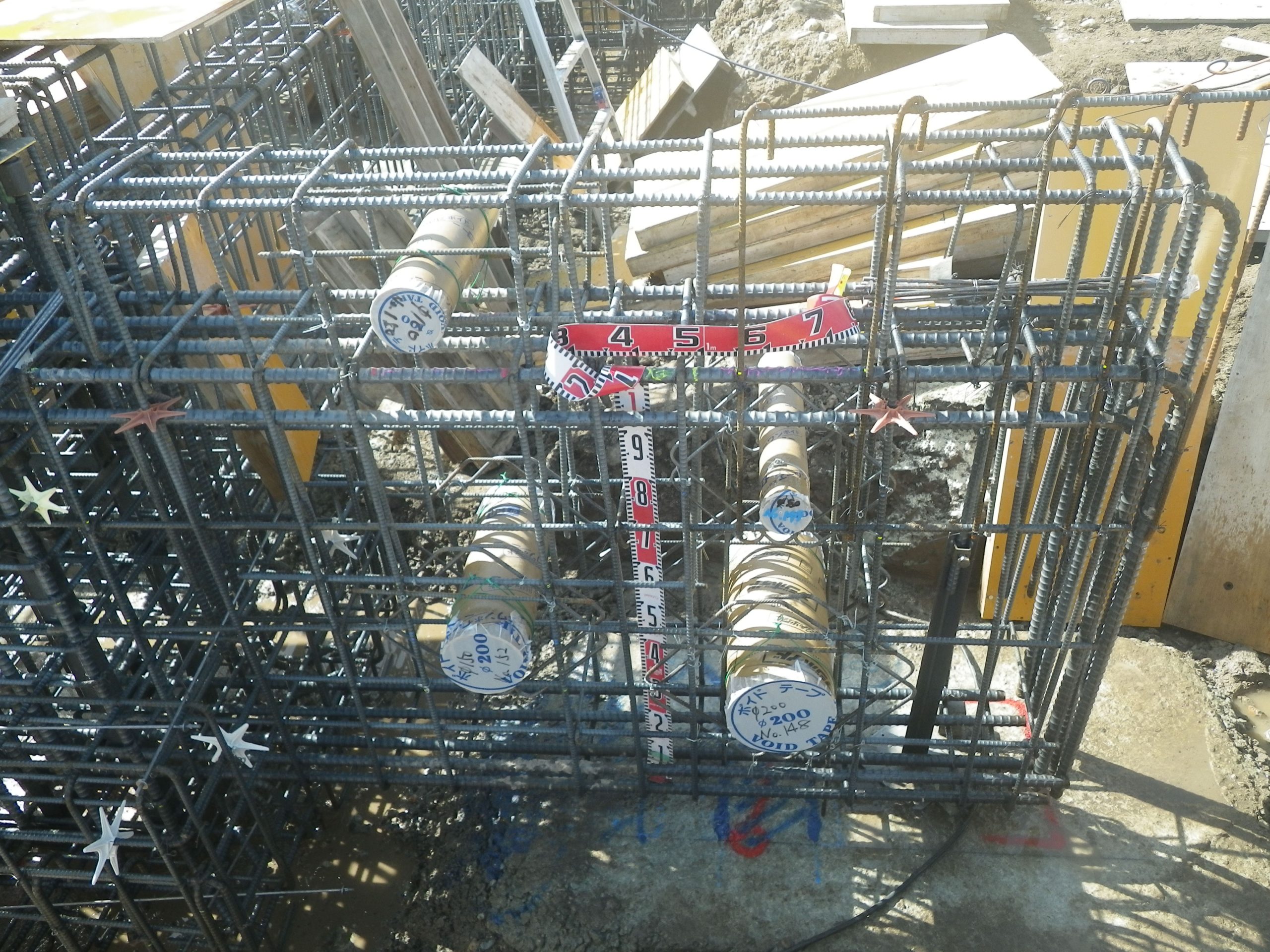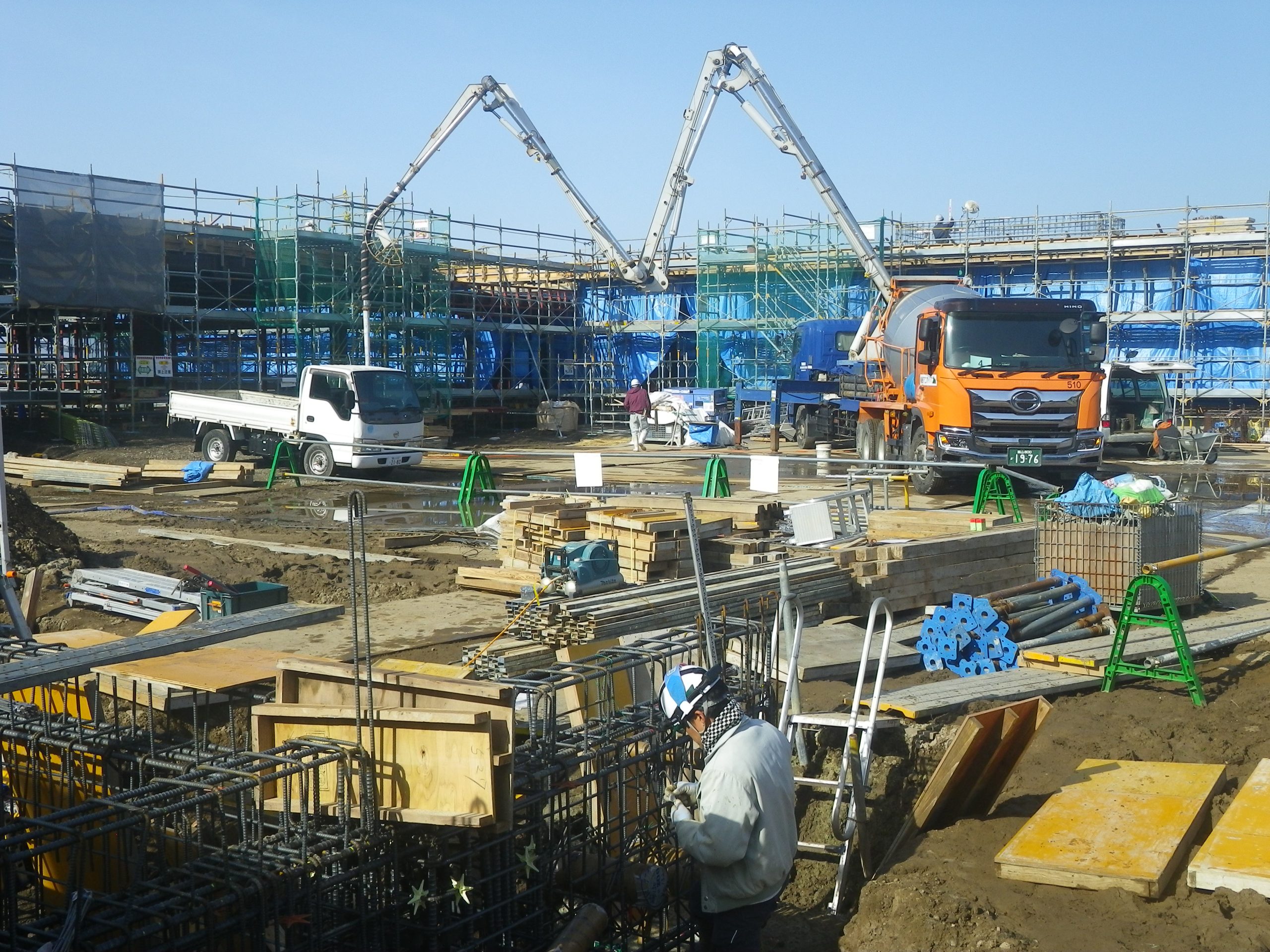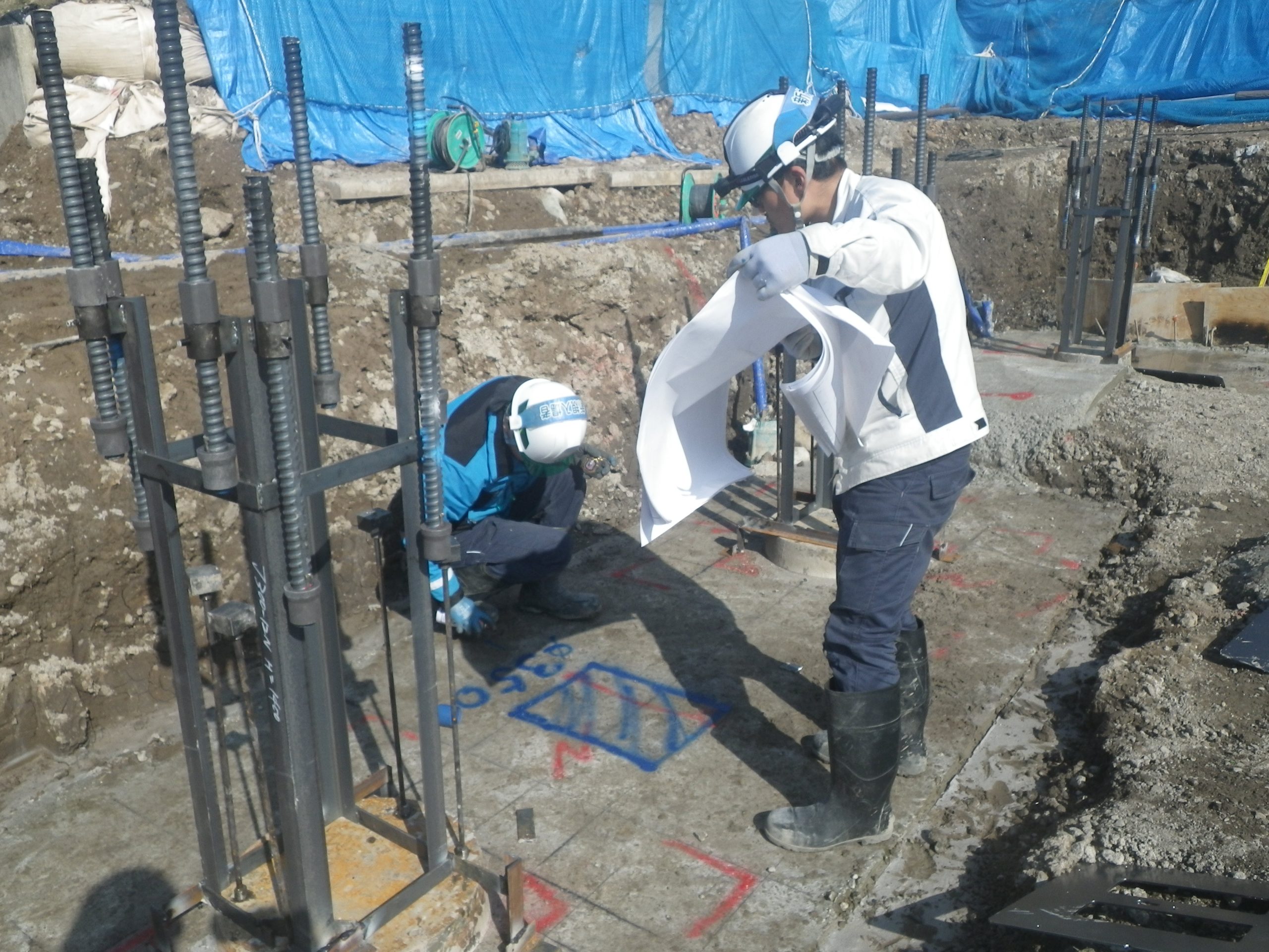 第一弾として「エレベーター棟(基礎)配管用ボイド管取付」を行いました。①3/11(火)に捨コンにボイド管取付位置に“墨出し”を行い、②3/13(木)“ボイド管取付”を実施です。