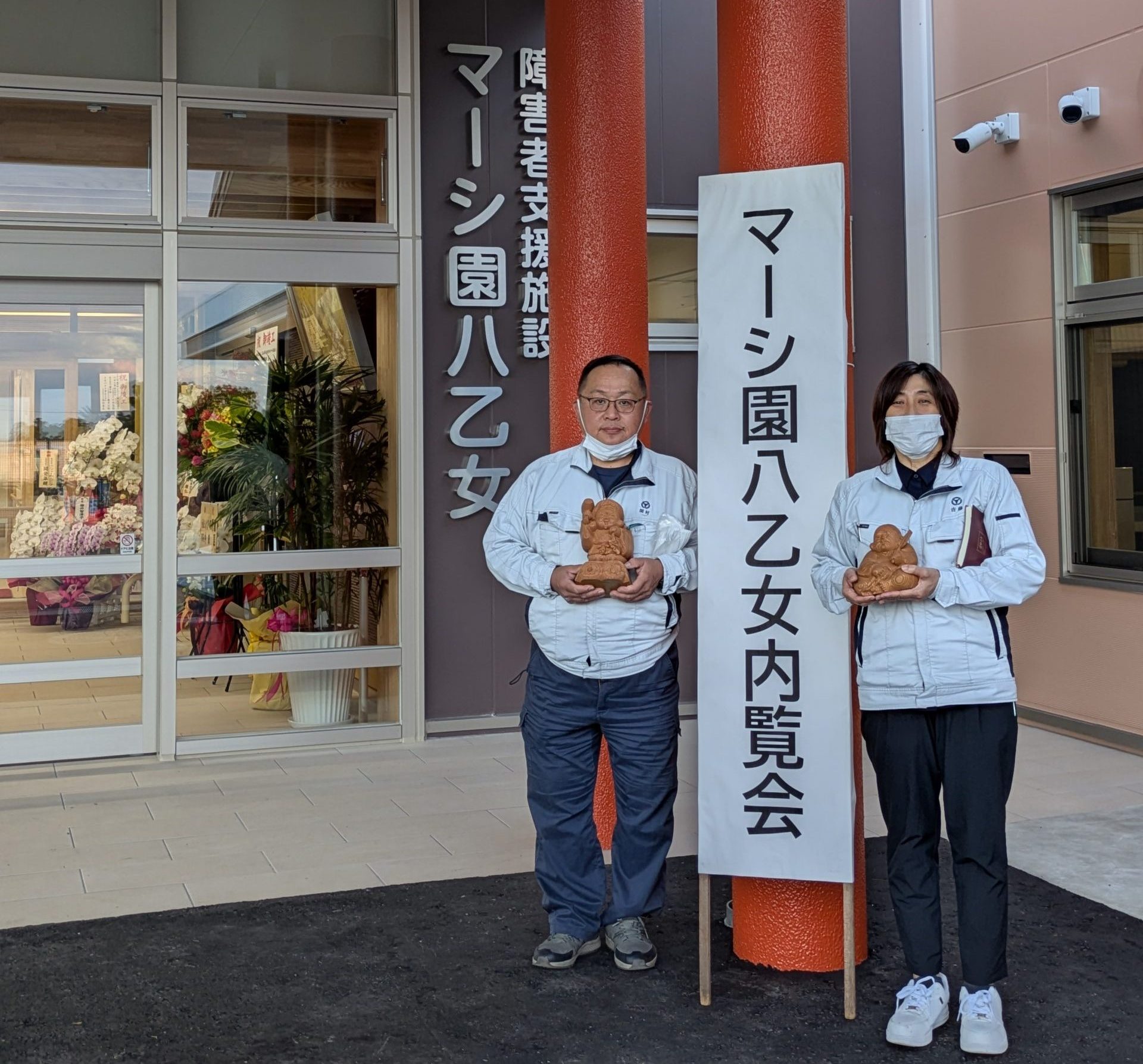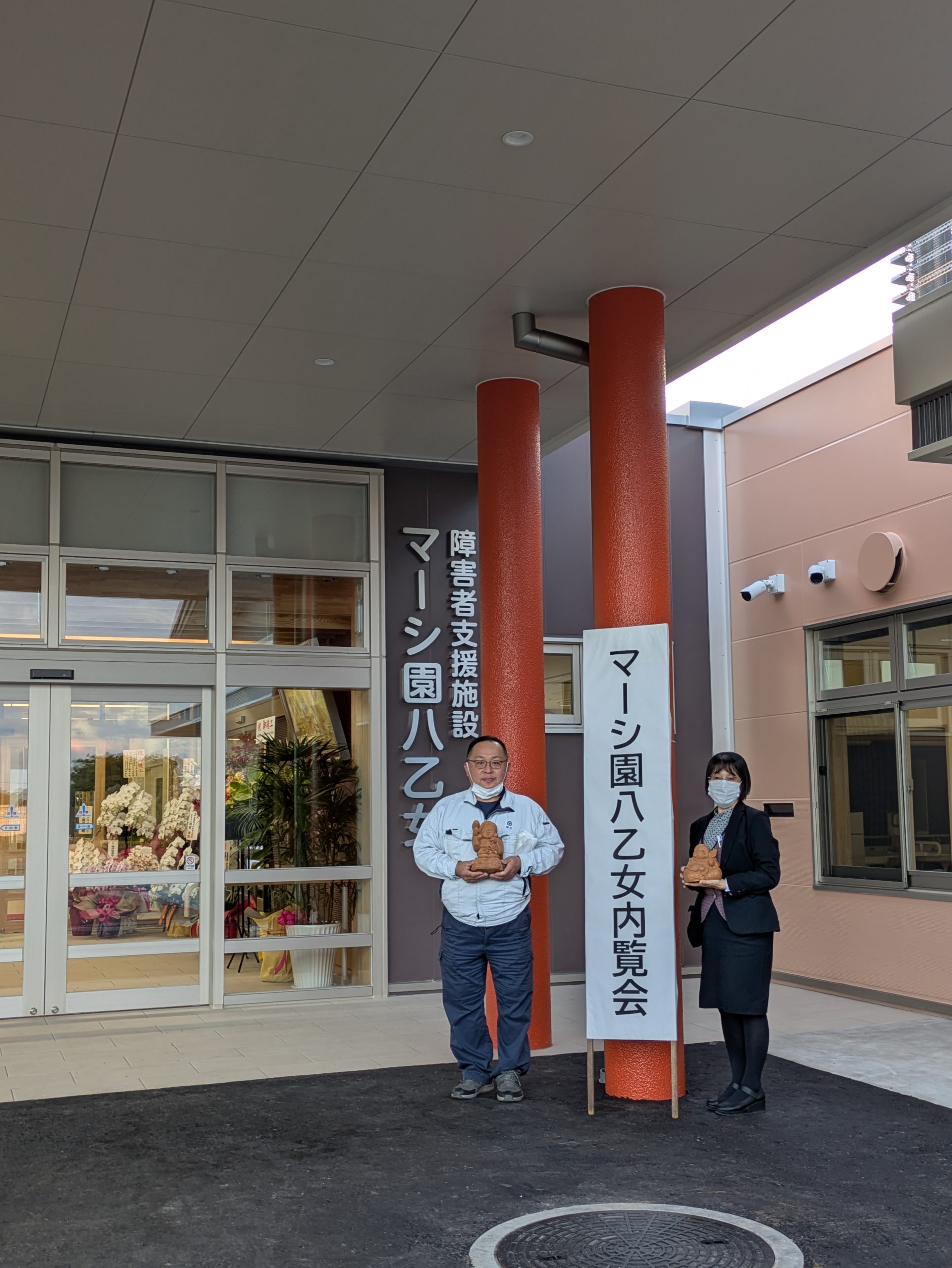 井波彫刻を手に持ってパチリ⭐左はヤマキ工業㈱の ✨関村専務✨です!右は笑顔の素敵なベテランスタッフの!!✨Tさん✨です!